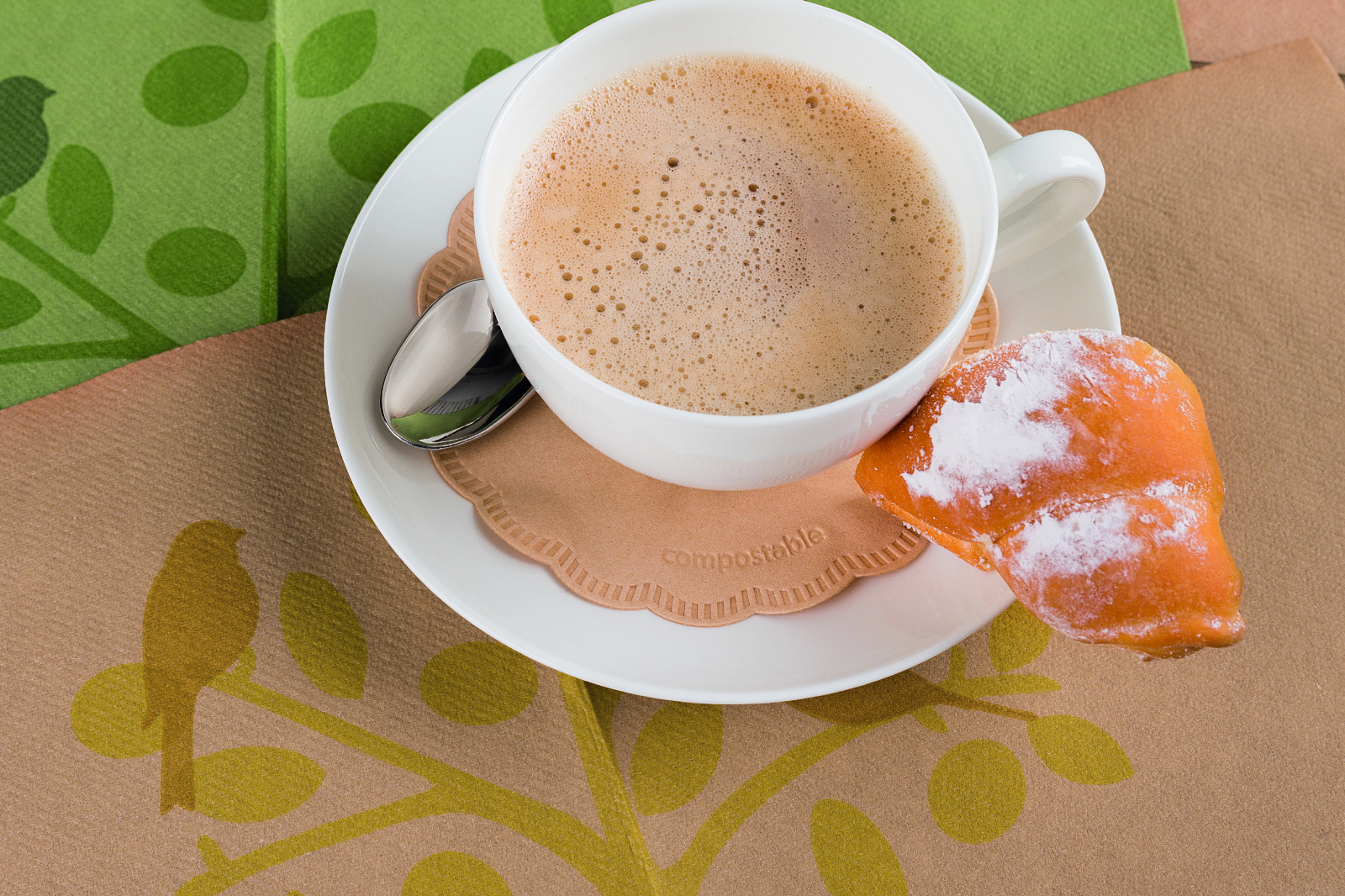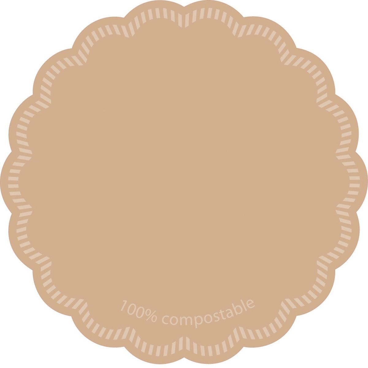 Coastere bej sau suporturi din hârtie pentru pahare sau cești, cu margine ondulată, 100% compostabile.