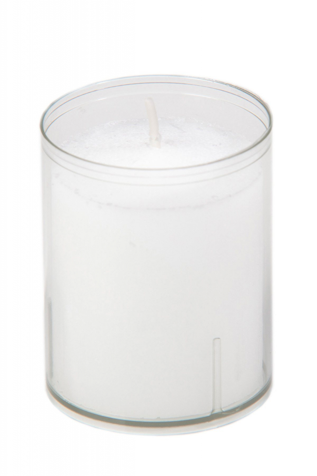 Lumânare în borcan de plastic transparent. Poate fi folosită ca atare sau introdusă în borcan special pentru lumânări.