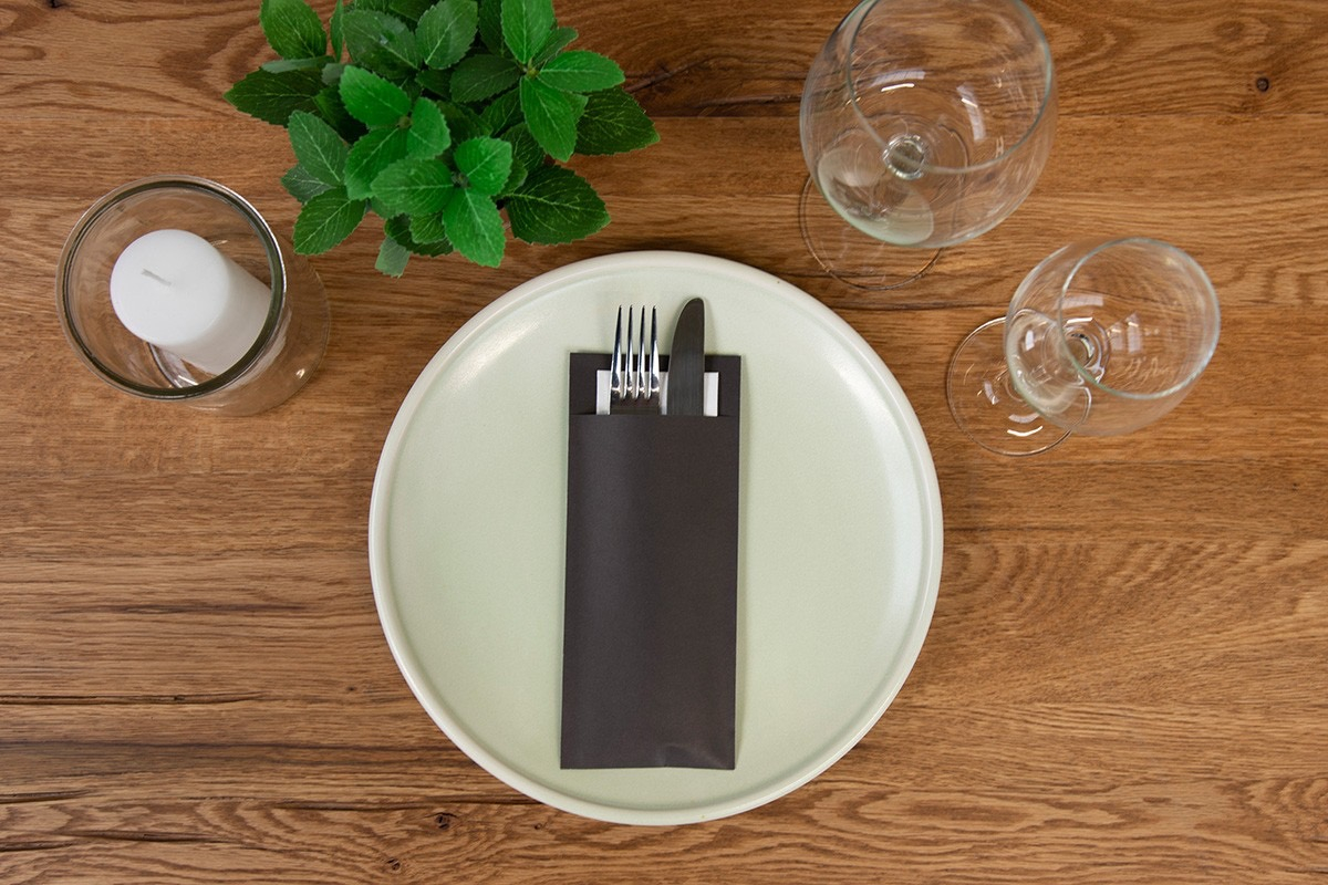 Port-tacâmuri negre din hârtie pentru tacâmuri + șervețel alb, pliat.