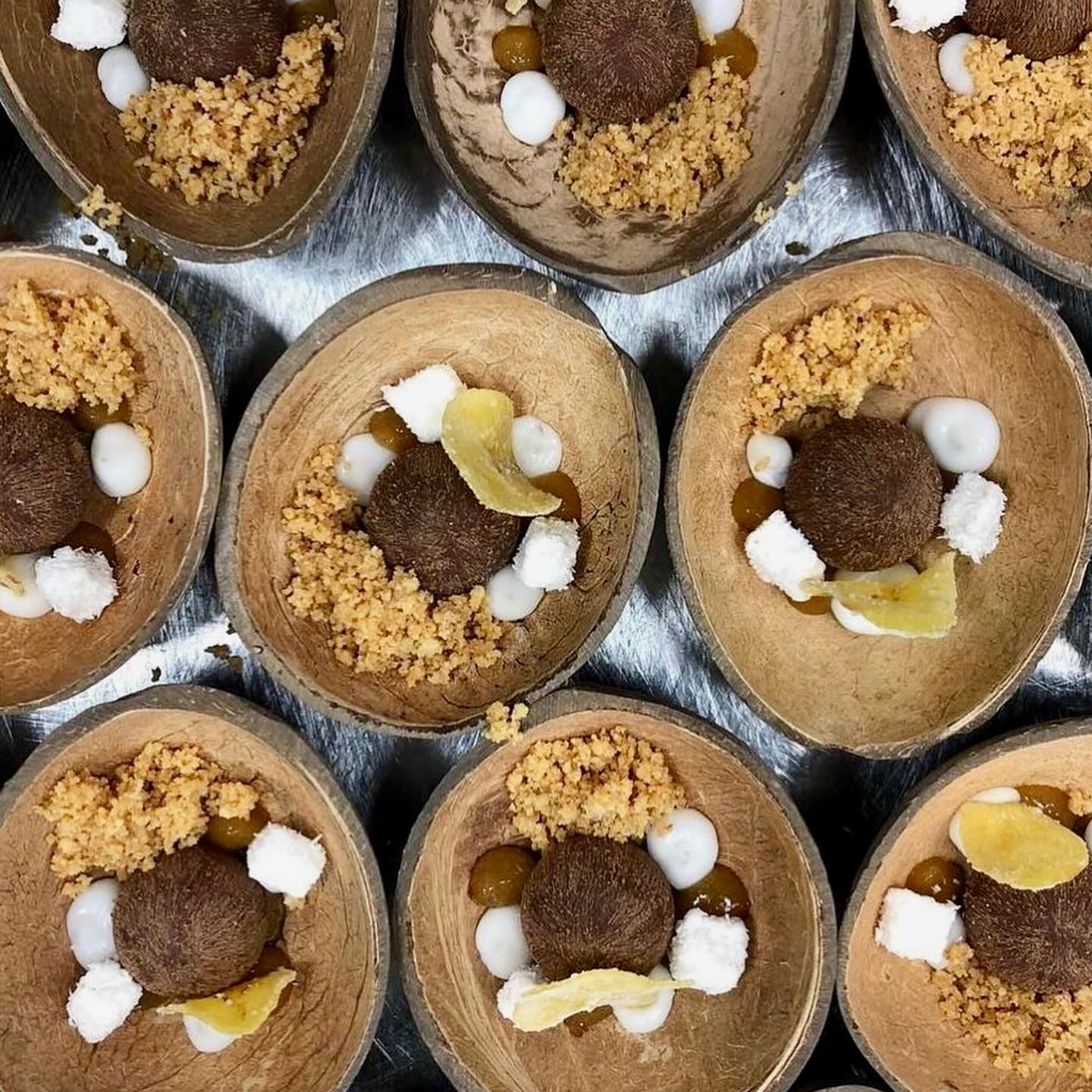 Boluri ovale biodegradabile, din coajă de nucă de cocos, ideale pentru prezentarea perfectă a operelor de artă culinară în zona de bufet.