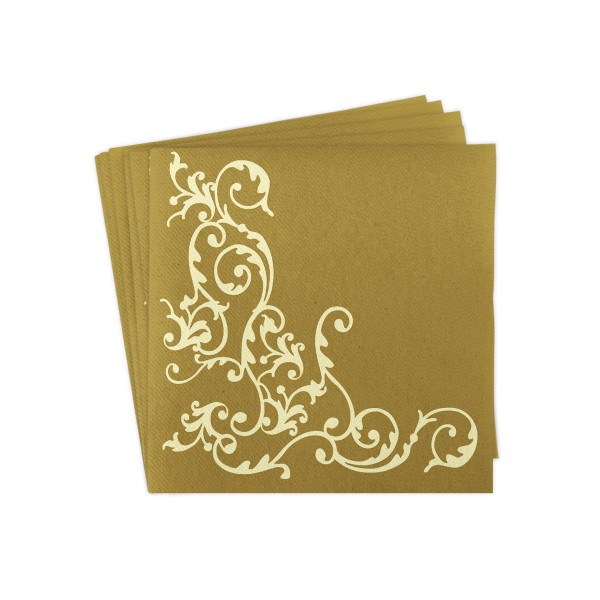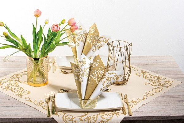 Șervețele festive crem cu imprimeu auriu, de o eleganță aparte, cu ajutorul cărora vei crea un decor de masă spectaculos.