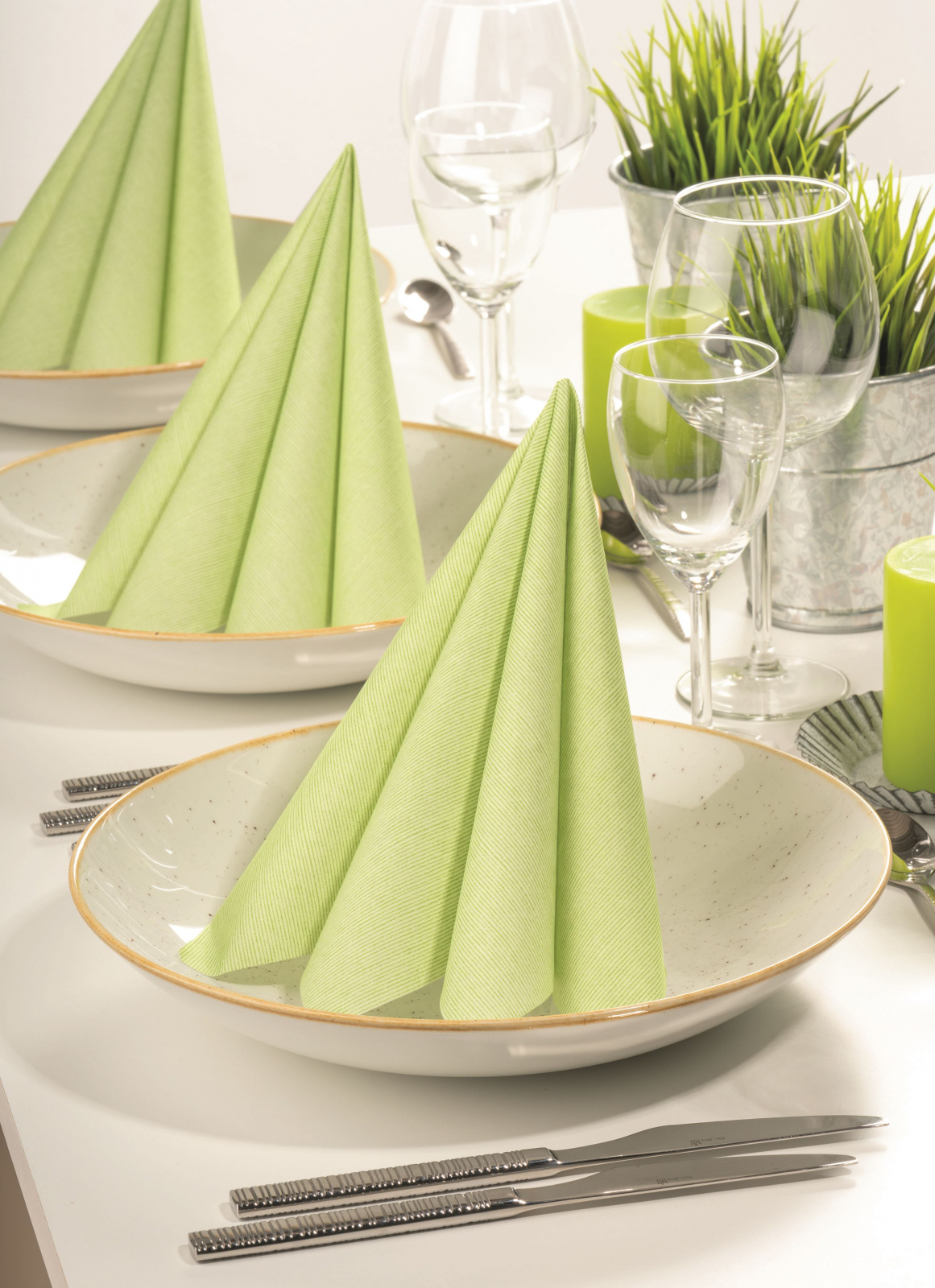 Șervețele oliv din gama Spanlin Bio, gama cu cele mai fine șervețele, 100% biodegradabile și aproape imposibil de distins de țesătură.